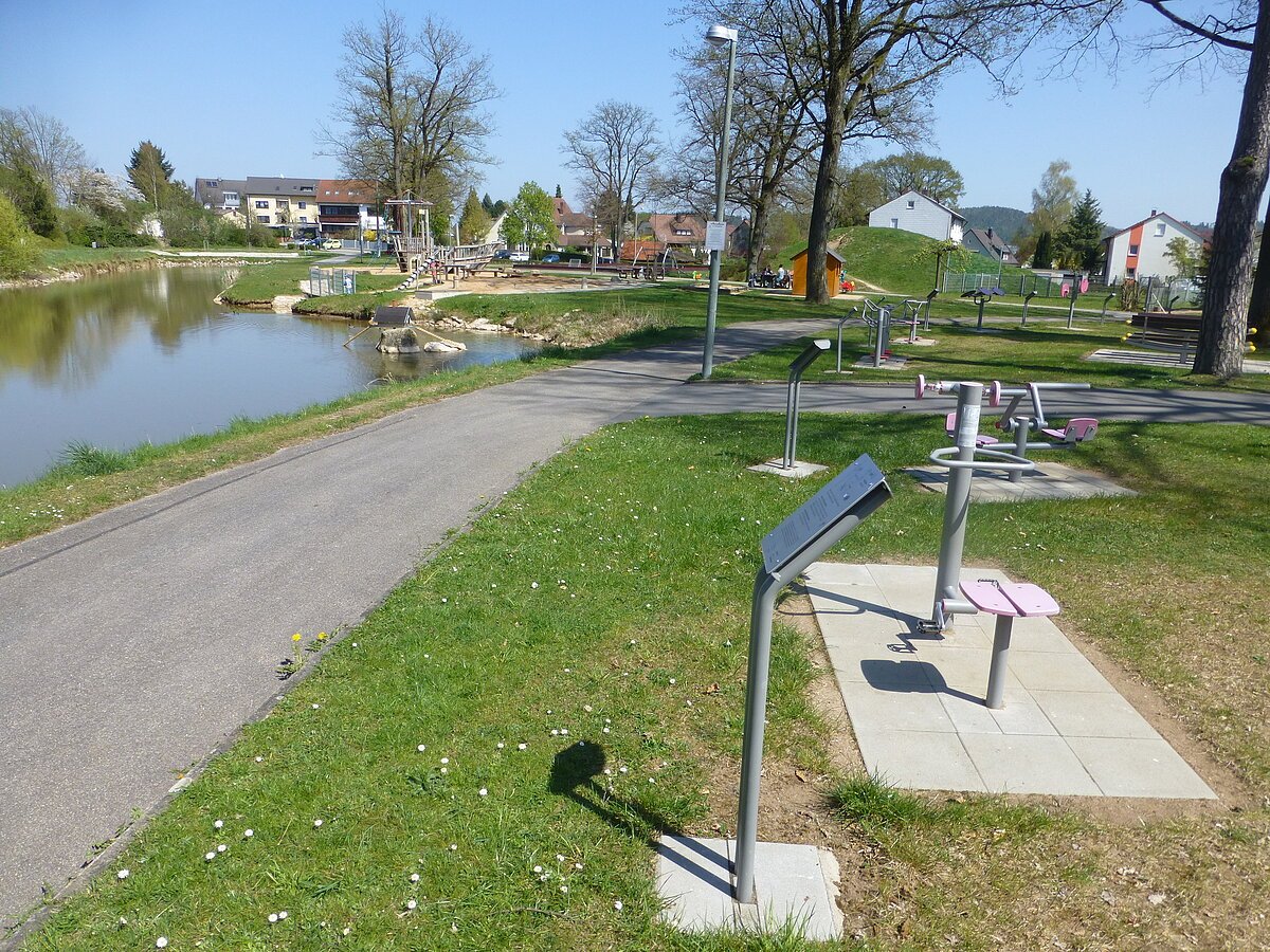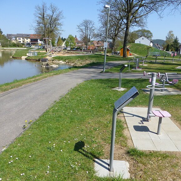 Auf dem Mehrgenerationenspielplatz am Bahnweiher können sich Kinder, junge Erwachsene, Senioren sowie Personen mit Gehhilfen körperlich betätigen.