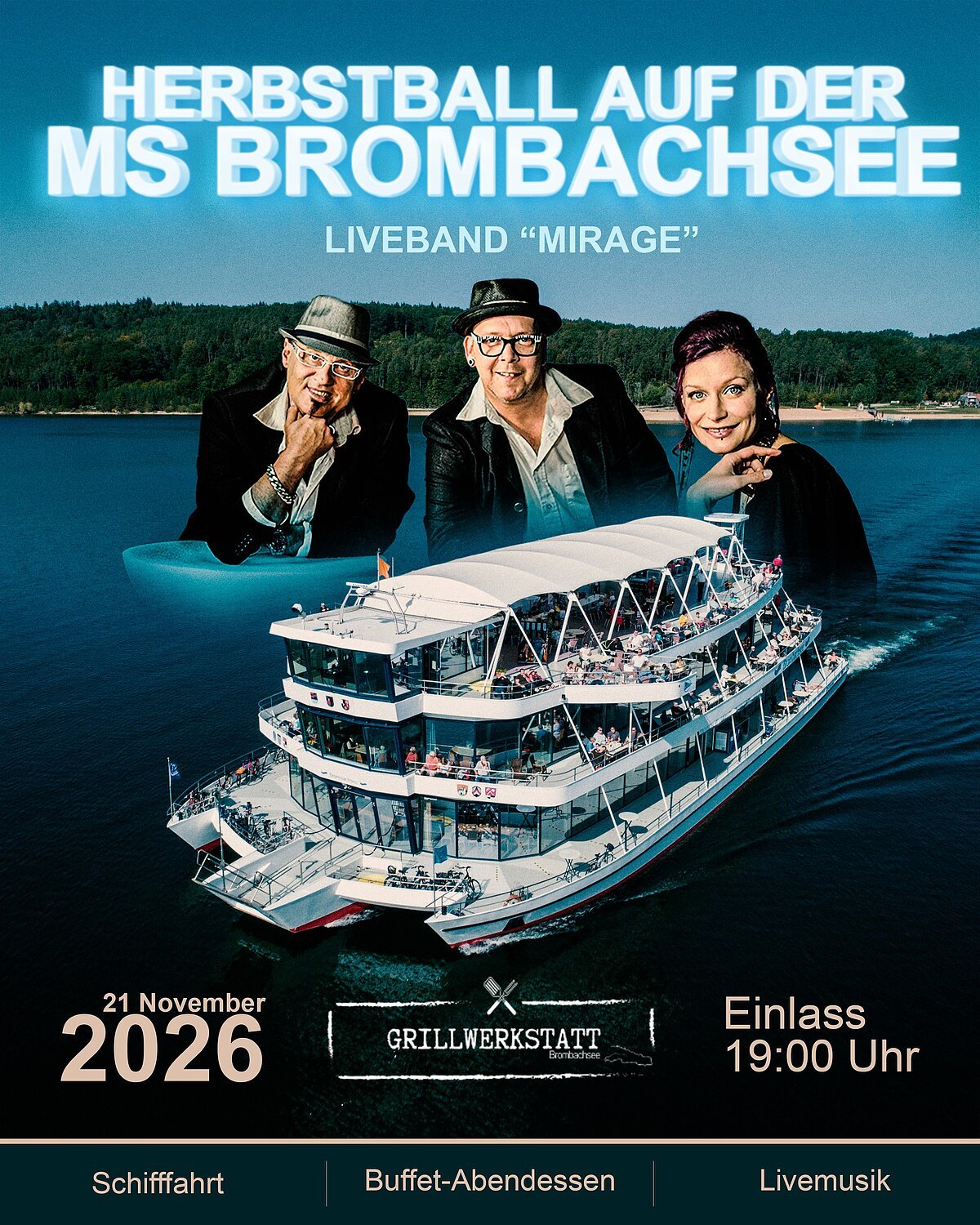 Wenn sich die Blätter färben und das Jahr seinem goldenen Finale entgegenneigt, lädt die MS Brombachsee zu einem festlichen Tanzabend, mit der Liveband "Mirage", auf dem Wasser ein.