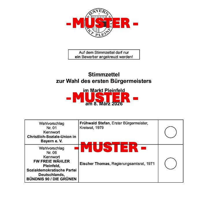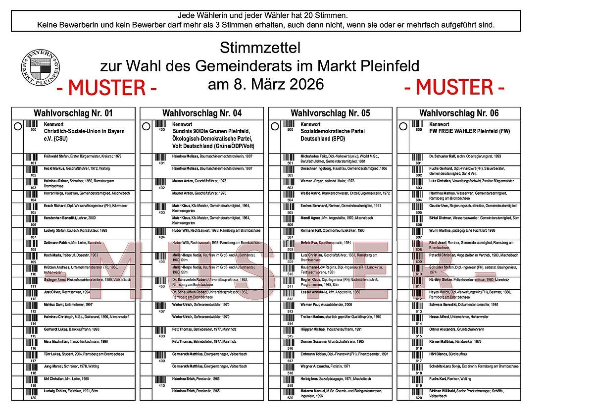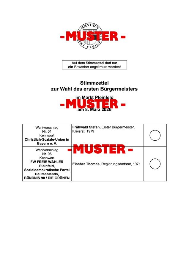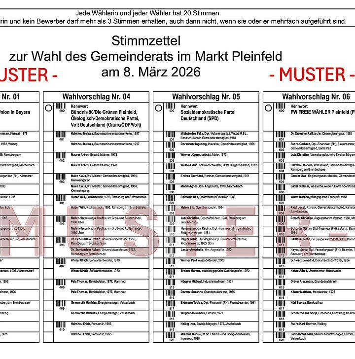 Am Sonntag, 8. März 2026, finden in Bayern die Kommunalwahlen statt. In 71 Landkreisen und 2056 Städten, Märkten und Gemeinden werden die Kreisräte, Stadt-, Markt- und Gemeinderäte sowie auch die meisten Landräte, Ersten Bürgermeister und Oberbürgermeister gewählt. Die Bürgerinnen und Bürger des Marktes Pleinfeld wählen insgesamt 20 Mitglieder des neuen Marktgemeinderates und den Ersten Bürgermeister bzw. die Erste Bürgermeisterin sowie die Mitglieder des Kreistags (60 Kreisräte) und den Landrat bzw. die Landrätin des Landkreises Weißenburg-Gunzenhausen.